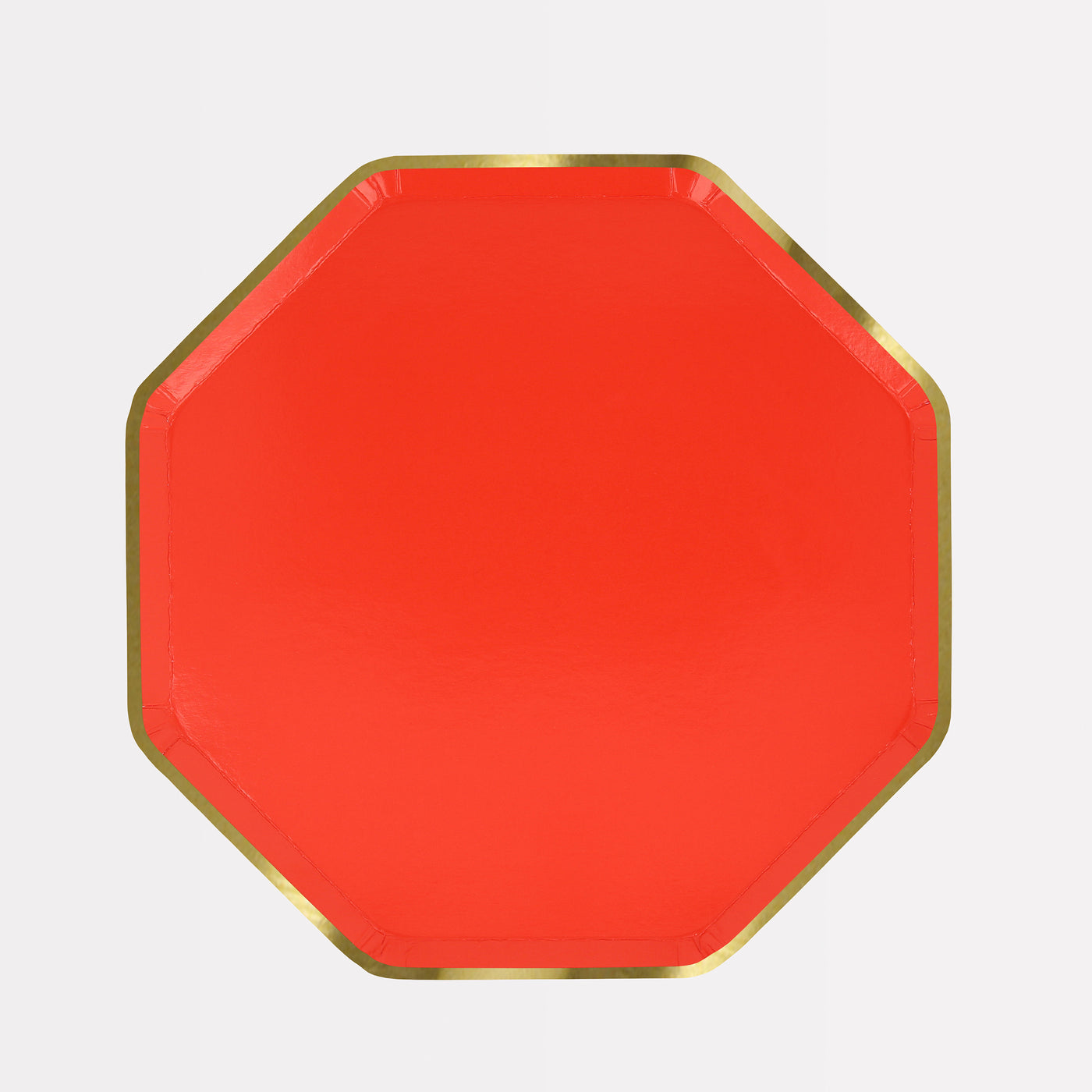 Food served on the side has never looked so stylish! These berry red paper plates, with an octagonal shape and shiny gold foil border, will add pizzazz to any party. The color is on both the front and back for an elegant effect. They are part of our stylish new take on mix and match tableware.