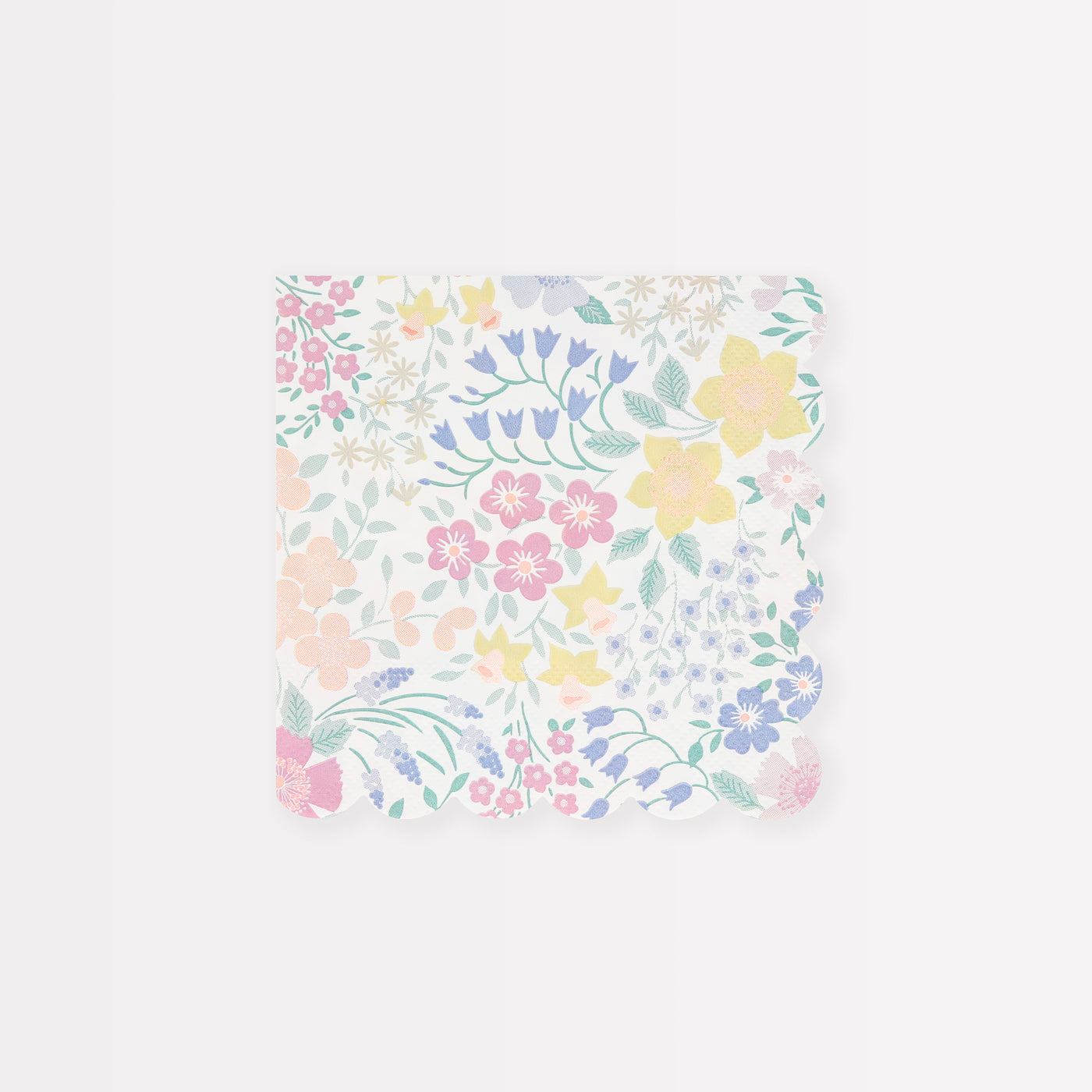 Welcome to our fantastic flower range! This pretty ditsy design is reminiscent of a cottage garden, with a field of floral wonder. Take your time to spot your favorites – daffodils, bluebells, daisies and many more – and instantly feel the joys of spring. These scalloped small napkins are the perfect tableware for a garden party, cocktail party, picnic, baby shower or bridal shower.