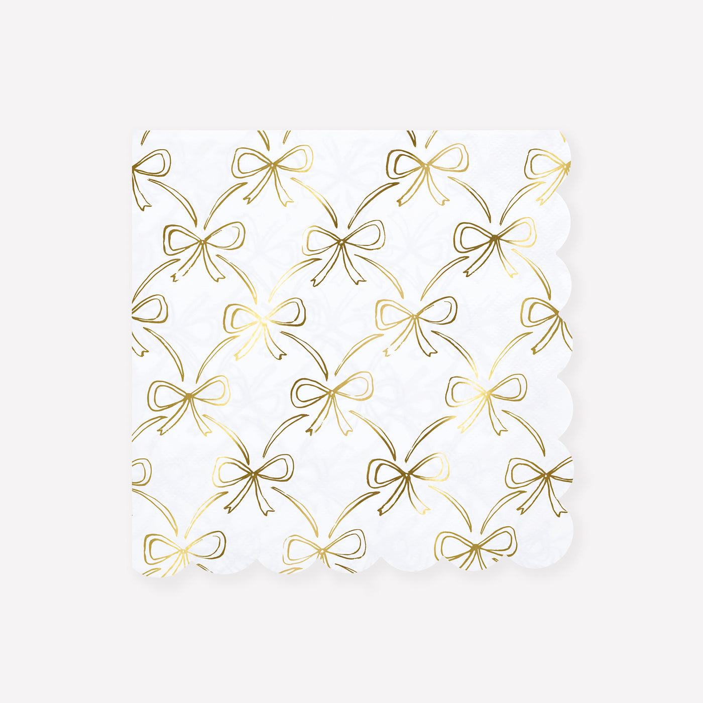 Add flair to your party with these elegant paper napkins. The combination of golden bows and a scalloped border, is guaranteed to bring effortless sophistication to your table, making every setting shine. Disposable napkins have never been this chic, and are perfect for the whole family to use. Ideal for Christmas, New Year, golden wedding anniversaries, bridal showers and special birthdays.