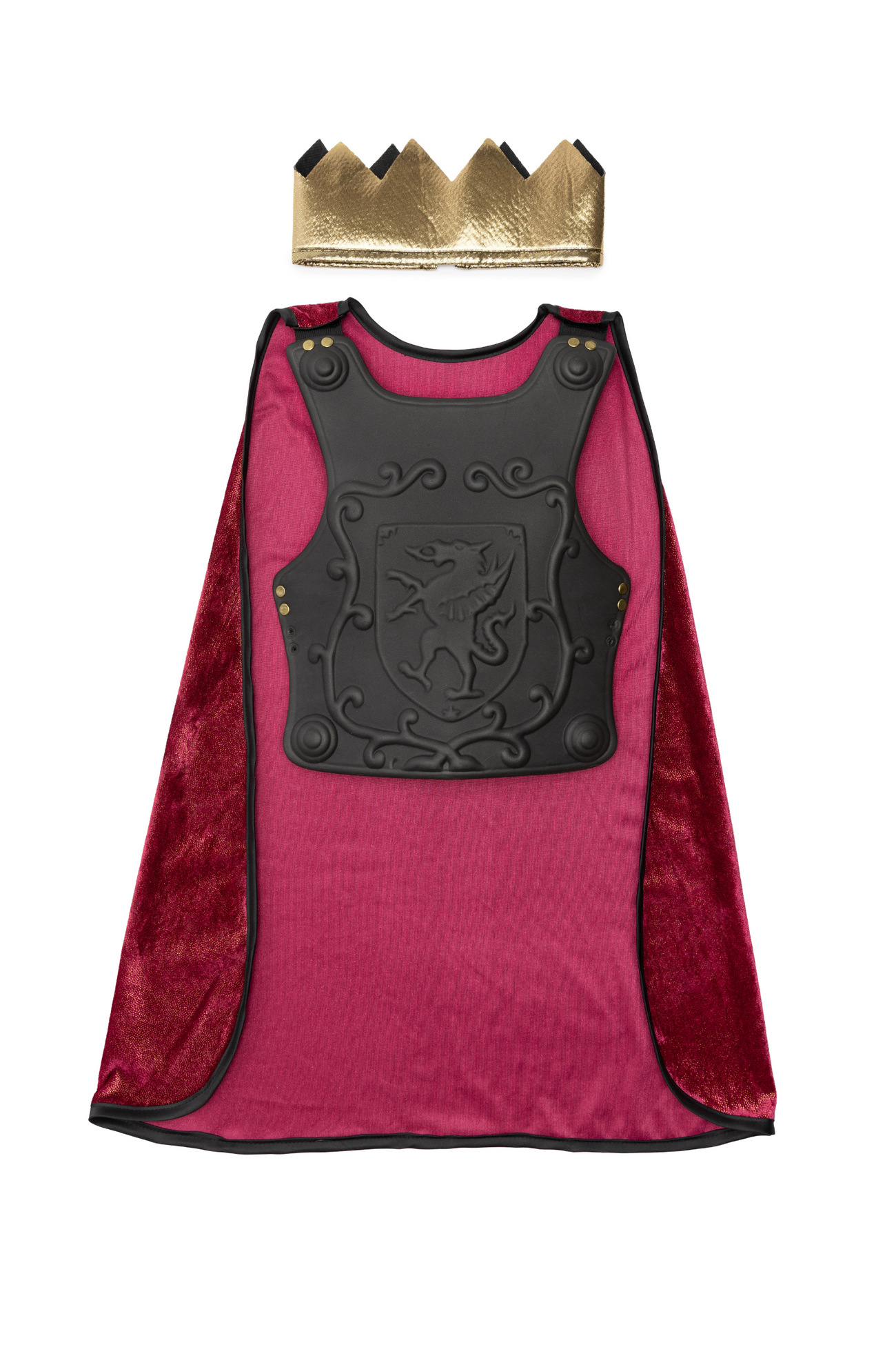 Attached to the chest plate is a regal crushed red velour cape, billowing with the grandeur befitting a heroic knight. As your child dons this ensemble, they'll be ready to defend kingdoms and conquer imaginary dragons with style. To complete the royal look, the set includes a beautiful soft gold crown, adding an extra touch of majesty.