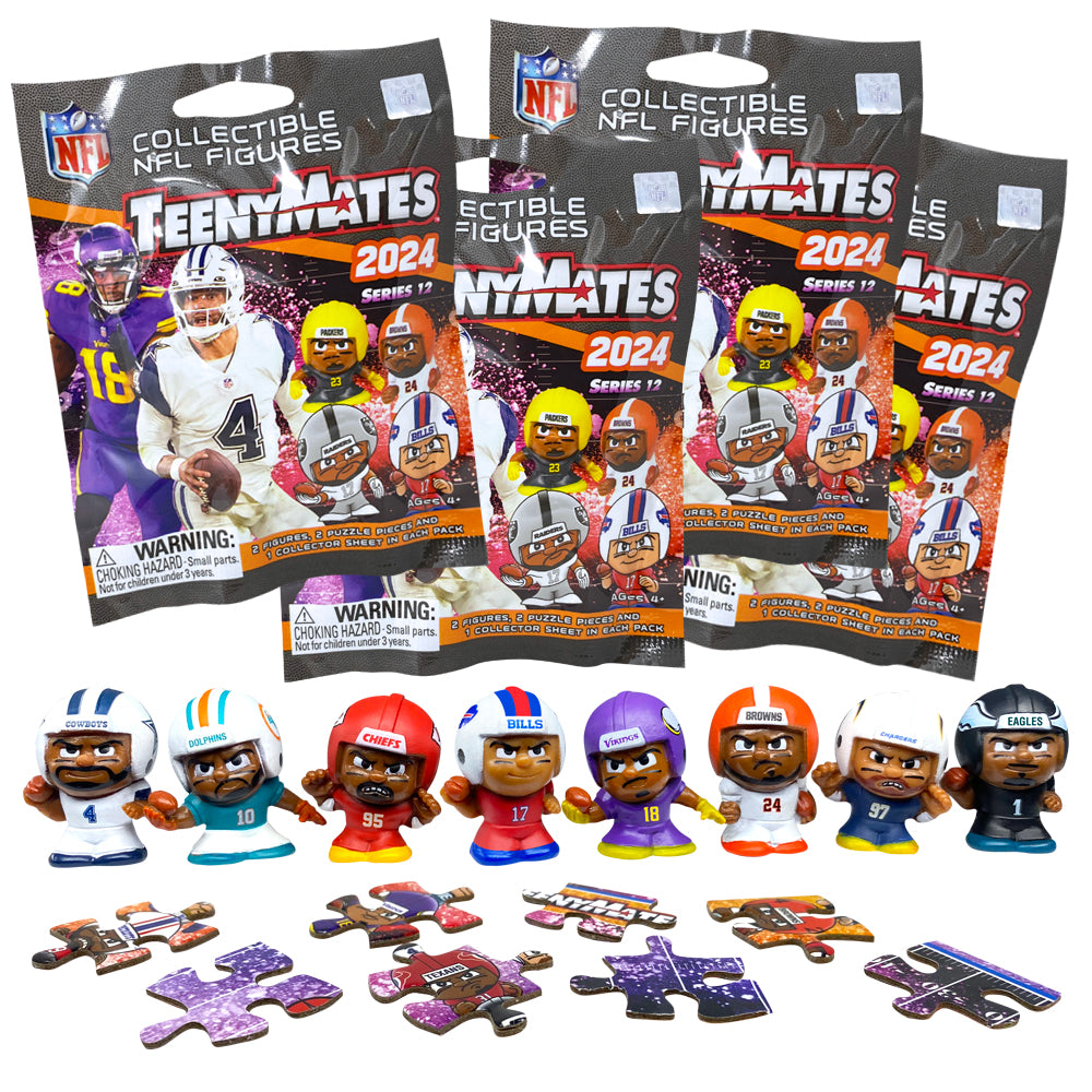 NFL TeenyMates feature all 32 NFL teams plus rare, hard to find figures. Completed 35-piece double sided puzzle features a mini poster on one side and a football field on the other.