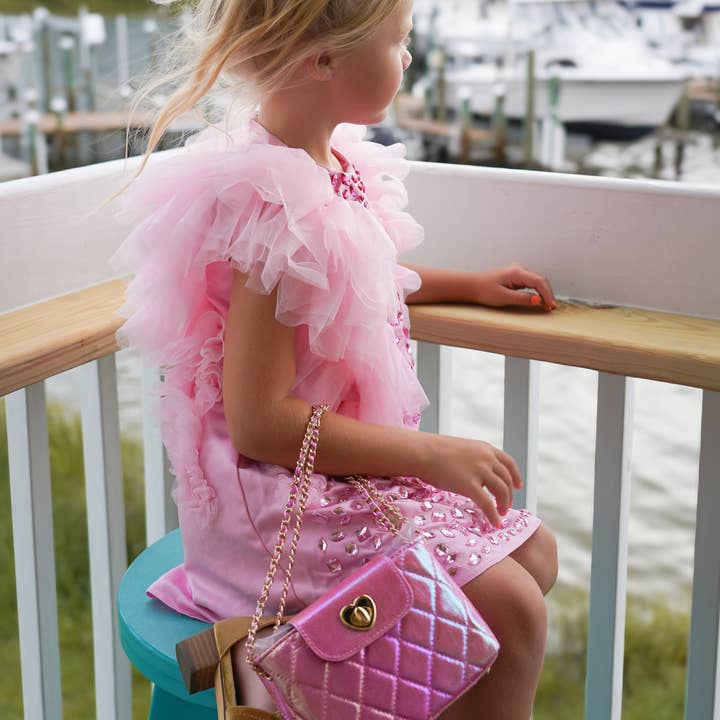 Sparkle, shine, and carry all her favorite things! The Paige Quilted Purse is made for kids who love a little glitter and a lot of fun. With its shimmery quilted fabric, this bag is as magical as her imagination. The comfy woven chain handle adds a stylish touch, while the matching interior lining and zippered pocket keep treasures safe. Whether itβs for a playdate, party, or just everyday adventures, the Paige is the perfect way to carry everything in style!