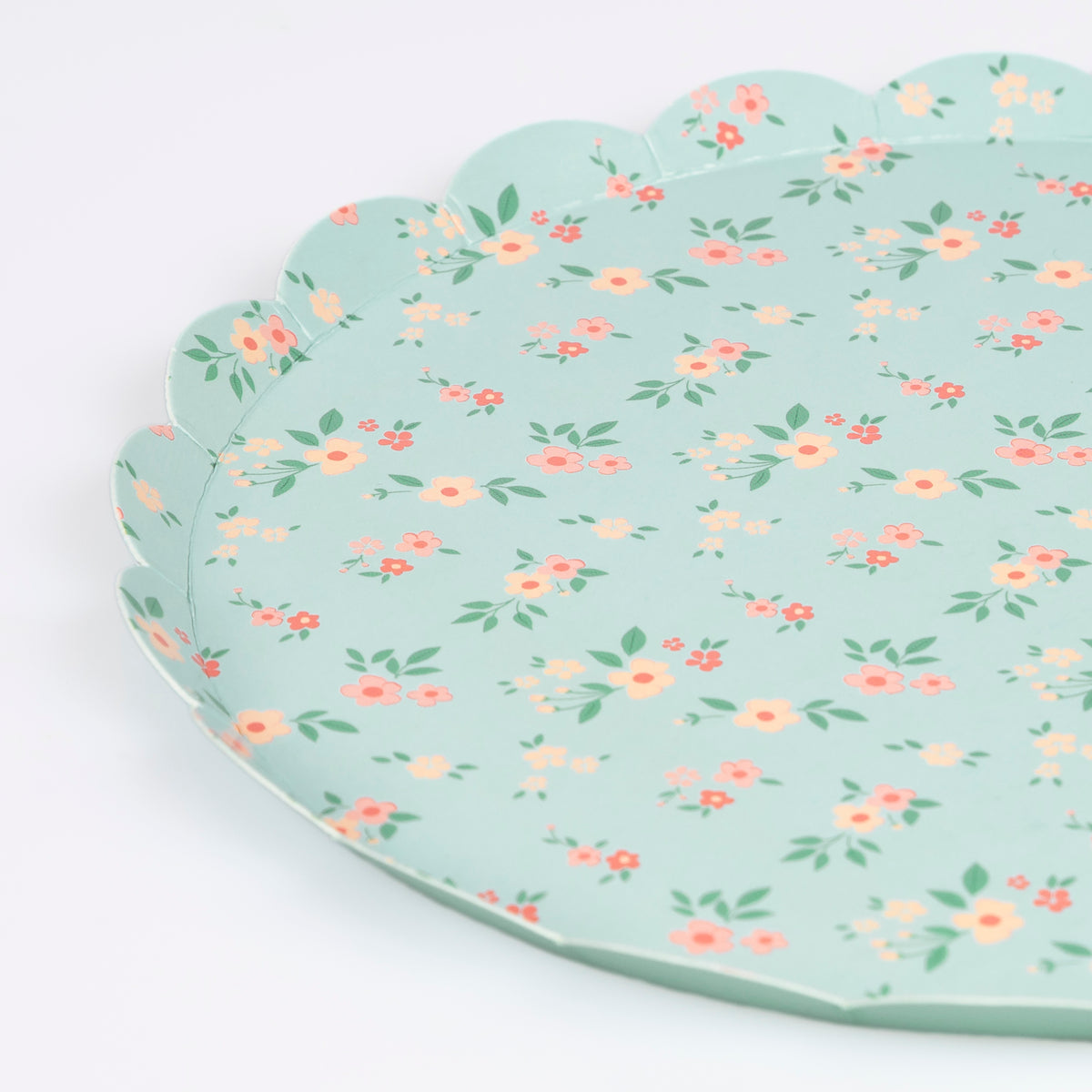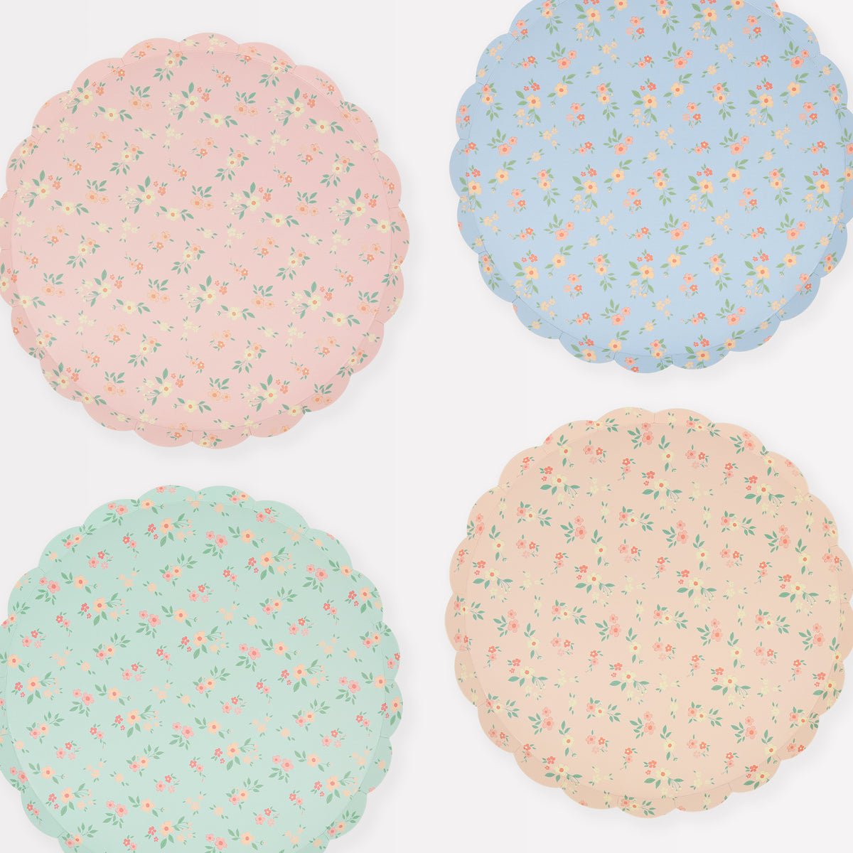 Ditsy floral clusters add effortless elegance to any setting. This classic design is influenced by floral pattern trends, with a scalloped border for a stylish look. The four different vintage color ways, of pink, peach, mint and blue, in this paper plate set are perfect for afternoon tea, garden parties, bridal showers or baby showers.